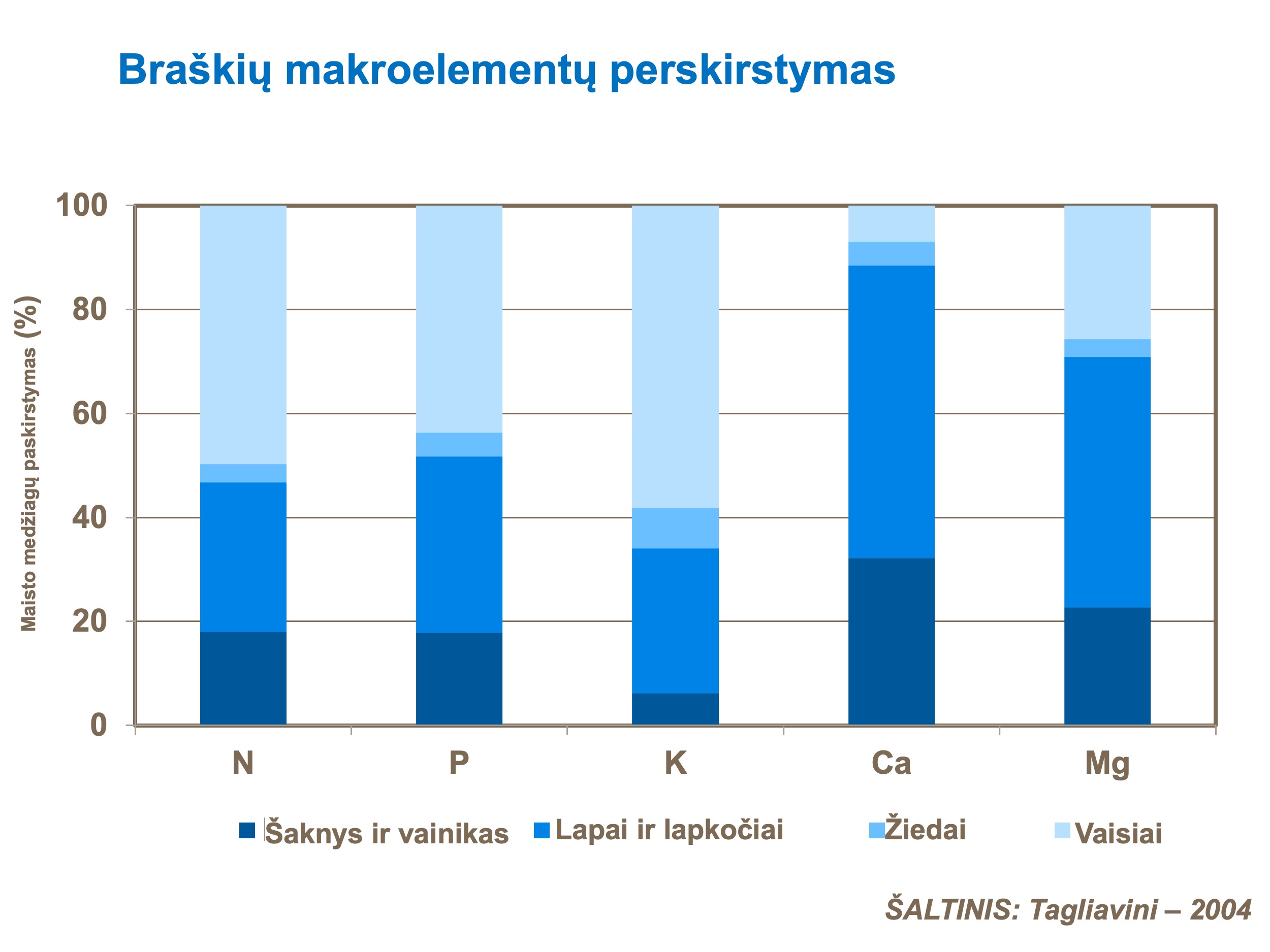 Tai pat reikia didelių kalcio kiekių. Įprastai kiekvienai vaisių tonai reikia apie 1,5 kg kalcio. Daug kalcio yra randama šaknyse, augalų lapuose ir lapkočiuose. Kalcio patekimas į vaisius yra ribotas daugiausia dėl to, kad kalcis yra įsisavinamas kartu su vandeniu ir tik per vandenį garinančius organus, taip parodydamas augalo įsisavinto vandens kiekį. Todėl, siekiant išlaikyti vaisių kokybę, o ypač jų tvirtumą ir laikymo terminą nuskynus, vaisiams būtina viso sezono metu reguliariai tiekti kalcį.