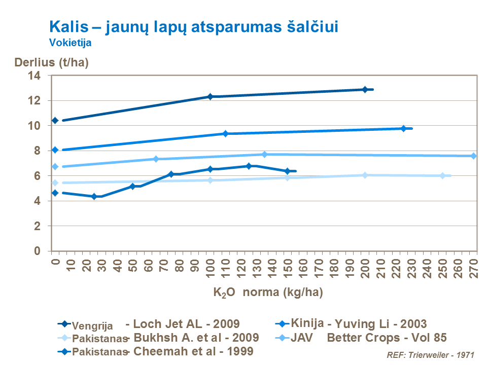 Bandymai patvirtina, kad kukurūzų pasėliai labai teigiamai sureaguoja, kai tręšiami didelėmis kalio trąšų normomis. Daugelyje šalių metinės kukurūzų pasėlių tręšimo normos kalio trąšomis svyruoja nuo 150 iki 250 kg K2O/ha. Siekiant padidinti kukurūzų pasėlių derlingumą, poreikiai kalio ir azoto trąšoms yra labai panašūs, o patręšus per mažomis azoto normomis, pablogėja kalio (K) įsisavinimas, sutrinka augalų augimas ir vystymasis. Kai kukurūzų pasėliams trūksta kalio ir fosforo, burbuolės viršūnė nepilnai užsipildo sėklomis.