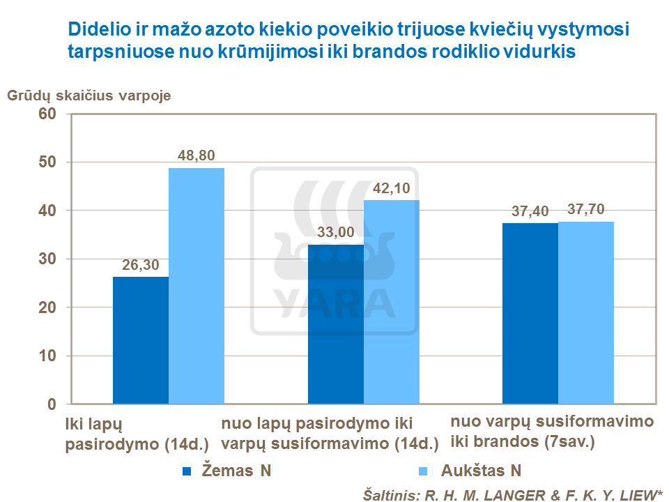 Azotas turi didžiausią poveikį galutiniam kviečių grūdų dydžiui ir svoriui. Ankstyvoje augimo fazėje patręšus pasėlius azoto trąšomis, susiformuoja platus lapų skliautas su dideliu angliavandenių kiekiu stiebe, kurie brandos tarpsniu pernešami į grūdus. Tai ypatingai svarbu auginant kviečius sausros sąlygomis, kur 60% grūdų derliaus gaunama iš tokių atsargų. Būtina kontroliuoti azoto kiekį augalų audiniuose, siekiant išvengti ankstyvo lapų skliauto išglebimo ir grūdų brandos tarpsnio sutrumpėjimo.