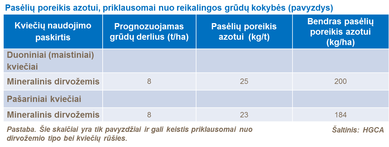 Grūdų baltymų kiekis pašariniuose kviečiuose, esant optimaliam tręšimui N trąšomis, paprastai sudaro apie 11% (tolygu 1,9% N). Duoniniai kviečiai rodo optimalius derliaus rezultatus, kur baltymų kiekis yra apie 12%, todėl, norint pasiekti rinkos rodiklį, viršijantį 13%, dažnai reikia papildomai tręšti azoto trąšomis. Mažas baltymų kiekis grūduose, t.y. mažesnis nei 10% pašarinių kviečių rūšyse, rodo mažesnį už optimalų azoto naudojimą. Svarbus yra ir tręšimo azoto trąšomis laikas. Tręšimas azotu ankstyvoje fazėje (25-32 fazės pagal Zadoksą) paprastai užtikrina didesnį derlingumą, o norint padidinti baltymų kiekį grūduose, azoto trąšas reikia naudoti tarp 37 ir 59 fazės pagal Zadokso skalę. Esant nepakankamam azoto atsargų kiekiui lapų audiniuose, galima imtis korekcinių veiksmų žydėjimo fazėje (70 fazė pagal Zadoksą), tręšiant augalus azoto trąšomis per lapus.