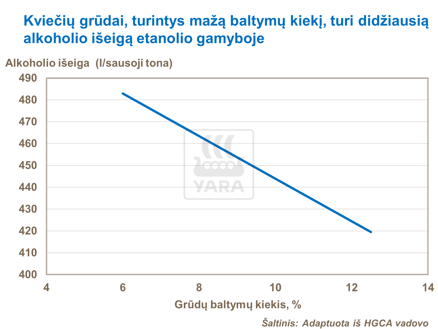 Azotas – tai svarbiausias mitybos elementas, turinti tiesioginį poveikį krakmolo kiekiui grūduose. Didelis etanolio kiekis yra atvirkščiai proporcingas azoto kiekiui grūduose, t.y. mažas azoto (arba baltymų) atsargų kiekis grūduose yra didelio krakmolo kiekio, vadinasi, ir galimai didelės bioetanolio išeigos iš žaliavos tonos požymis. Jei kviečiai yra specialiai auginami etanolio gamybai, tuomet tręšimo azoto trąšomis normas reikia sureguliuoti pagal šios rinkos reikalavimus. Azoto trąšomis reikia tręšti pradinėje augimo fazėje; be to, reikia vengti vėlesnio tręšimo azotu, kuris padidintų baltymų kiekį grūduose.