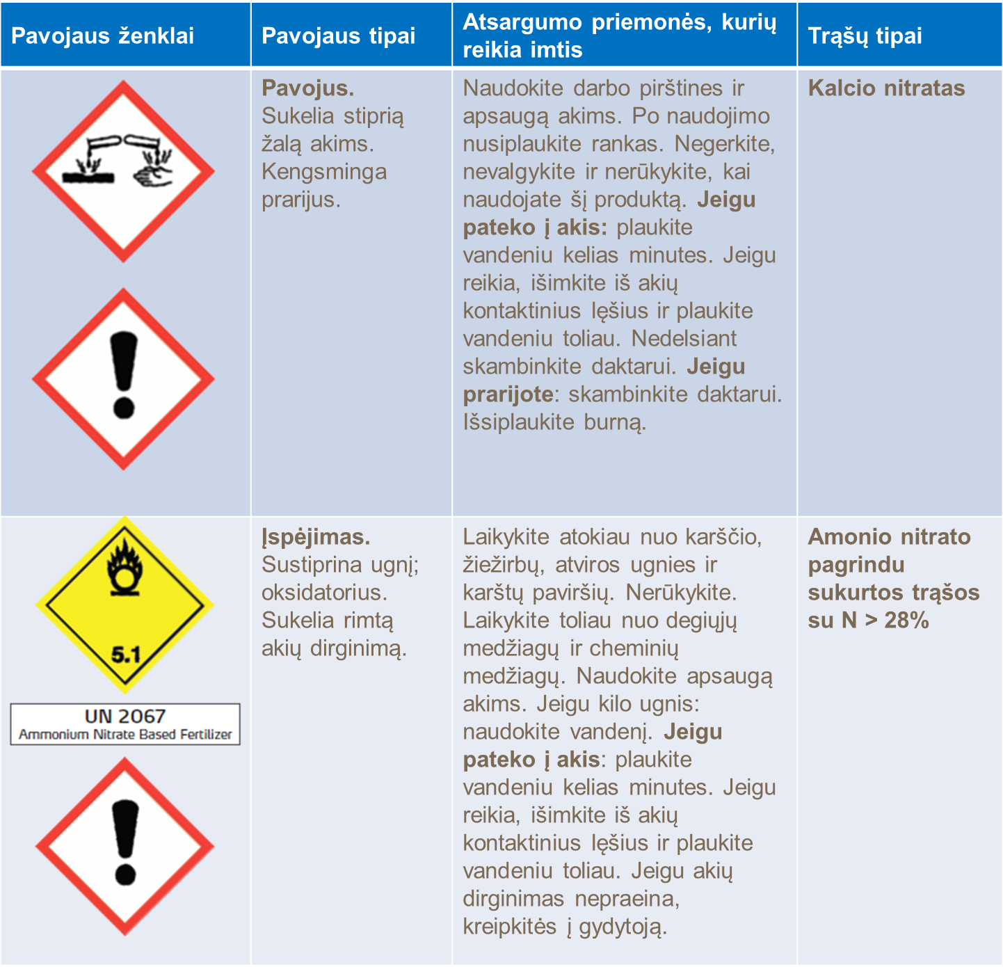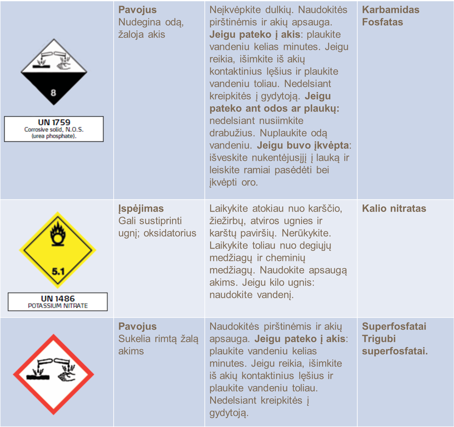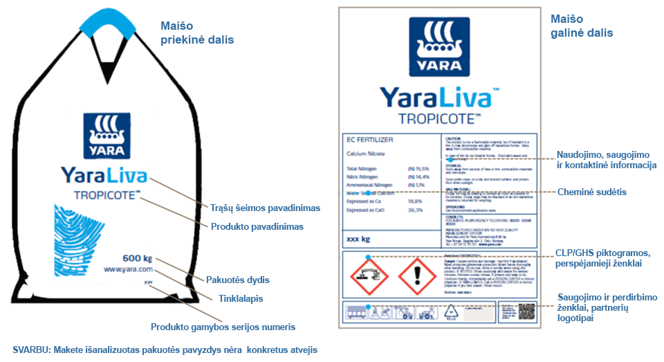Trąšų pakuotės etiketėje rasite svarbią informaciją apie trąšų gabenimą, sandėliavimą, laikymą, tvarkymą ir naudojimą. Produktas yra klasifikuojamas ir ženklinamas pagal nacionalinius teisės aktus ir EB reglamentą ir pagal prekių vežimo klasifikaciją, remiantis pavyzdiniu JT reglamentu dėl pavojingų krovinių gabenimo bei transportavimo (TDG angl.). Produkto cheminė sudėtis produkto pakuotės etiketėje yra nurodyta pagal nacionalinius, kiekvienoje šalyje galiojančius įstatymus. Vietinėje pardavimų įstaigoje jums gali suteikti papildomą jums aktualią informaciją ir reikiamą pagalbą.