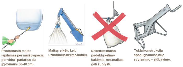 - Didmaišių kėlimo įrenginio kablys turėtų būti užapvalintais kraštais, kad nesuplėšytų maišo kilpos.
