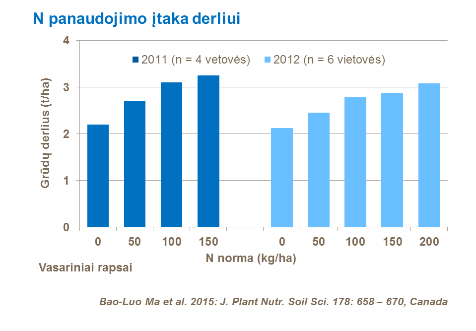 Žieminių rapsų pasėliai absorbuoja azoto tirpalą nitrato pavidalu. Bandymų metu, kontroliuojamomis sąlygomis paaiškėjo, kad tręšiant pasėlius karbamidine (karbamidu) ar amoniakinio (amonio sulfatu) azoto forma, lyginant su išskirtinai nitratu ar amonio nitratu, azoto veiksmingumas bei efektyvumas buvo mažesnis, ko pasėkoje lėčiau augo ir vystėsi šaknys ir antžeminė augalo dalis, atitinkamai 75% ir 50%.