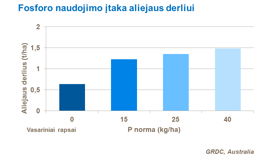Dauguma dirvožemių palaiko pakankamus forsforo išteklius ir patenkina ankstyvojo periodo poreikį. Vėliau, augimo sezonui įpusėjus, fosforo reikia ankstyvam augalų žydėjimui ir atlieka labai svarbų vaidmenį, nes yra energijos laidininkas, taip pat padeda kaupti ir išsaugoti energiją augalo ląstelėje, todėl svarbu aprūpinti rapsų pasėlius pakankamu fosforo kiekiu pagal augalų poreikį, kad padidėtų aliejaus ir baltymų kiekis sėklose.