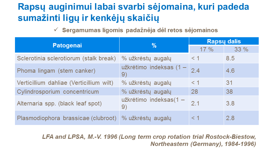 Siekiant sumažinti užsikrėtimo riziką ligos sukėlėjais, svarbu kad pasėlių rotacija būtų taikoma nuo 3 metų (17%) iki kas 6 metai (33%).